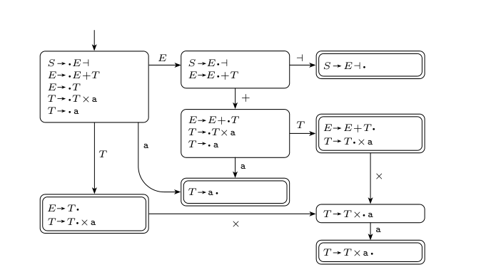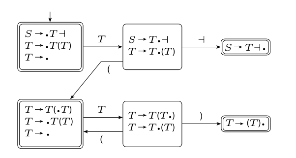 At each step, we run the current string through the machine to end up in a single accept state. If an accept state has multiple rules then we wouldn’t know which one to apply. If an accept state has a terminal symbol transition then we’d be able to move on to another rule, and the result would still be ambiguous. However, if we can transition out of the accept state with a symbol then that previous state is not actually a forced handle, so we safely move on.
